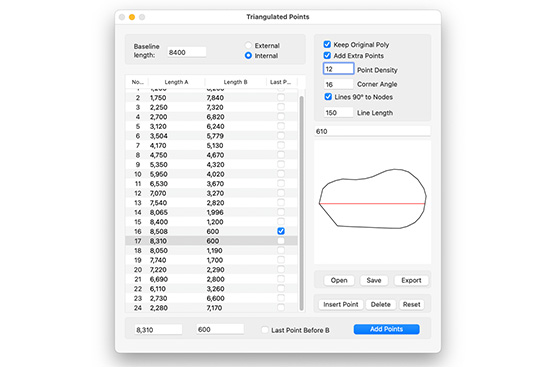 The Triangulated Points tool is a simple stand-alone program which takes the output from normal surveying measurements and generates an outline profile for editing in CAD software or direct cutting. Typically Triangulated Points is used to pattern products like swimming pool covers and other asymmetrical shapes.