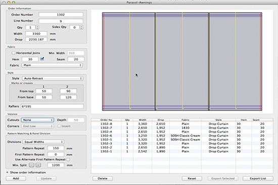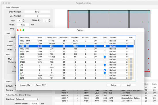 ParaSol has a fabric database which can be edited directly in ParaSol or imported as a CSV file from your order management system. Fabric widths, fabric orientation rules, stripe widths and positions, creasing or marking, cut speed and pressure… all these details are saved in with the fabric so selecting one, sets everything right down to when it's cut.
