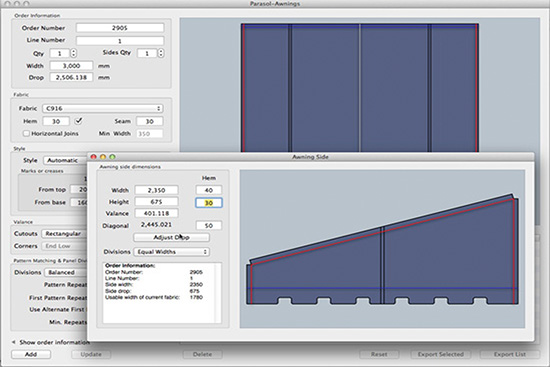 ParaSol Awnings makes vertical seam position and fabric widths easy. Plain or striped fabric patterns are generated in seconds with a minimum of input whether you're looking for appearance or economical use of fabric.